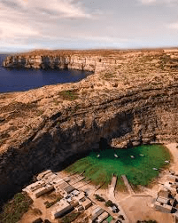 Gozo Adası Dwejra Koyu – Azure Window – Inner Sea: Victoria şehrinden sahile giden yolun sonu. Gozo hatta Malta adası genelinde en bilindik yerlerden biri ancak aşağıdaki bu manzara artık resimlerde kaldı. Bir fırtına ile kemeri yıkıldıktan sonra bu görünüm kalmadı. Burası ayrıca Game of Thrones’da Khaleesi ve Khal Drogo’nun evlendiği sahnenin çekildiği nokta. Sakın ola bu taş yıkıldı görmesek de olur demeyin inanın çok güzel. Buranın hemen yanında, Inland Sea (İç deniz) olarak anılan ve kayalık yamaçtaki gizli bir yarıktan akıp gelen deniz sularının doldurduğu bir krater var.