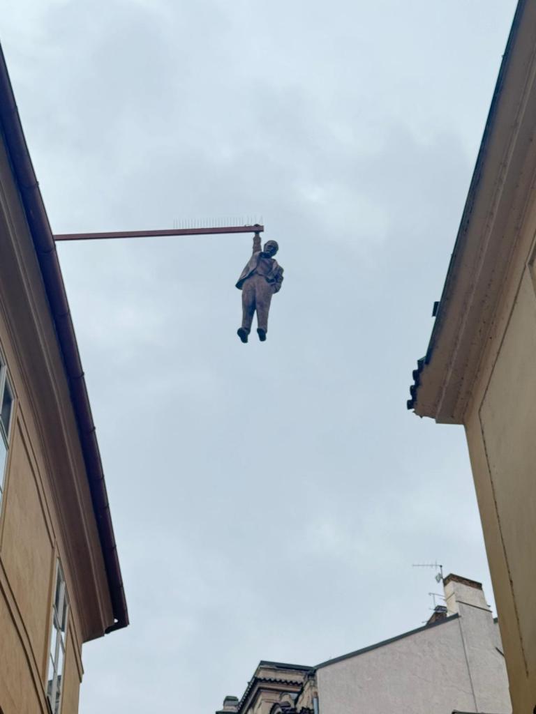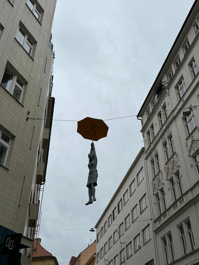 Mala Strana bölgesini gezerken Lesser Tower civarında görebileceğiniz ilgi çekici heykeller: Şemsiyeli adam (Hanging Umbrella Man), şemsiyeli kadın, asılı adam ve böcek