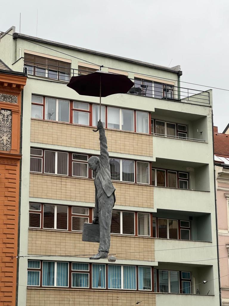 Gövdesiz heykel: İspanyol sinogunun hemen yanında heykeltraş Jaroslav Rona tarafından yapılmış gövdesiz takım elbiseli figür, omuzlarında Kafka’yı taşımakta.