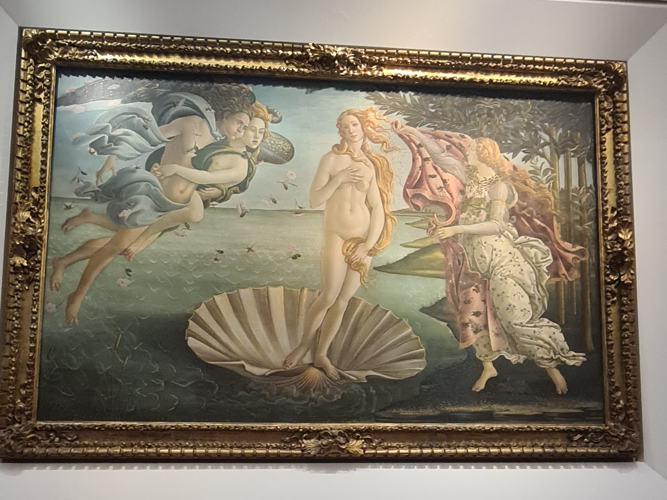 The Birth of Venus : This painting, made between 1482-1486, depicts the moment when Venus, the goddess of love and beauty in Roman mythology (Aphrodite in Greek mythology), is born from the sea and comes to shore on a seashell. She is born and brings love and beauty to the world. On the left, Zephyr, the god of the west wind, and Chloris, embracing him, blow wind towards Venus, allowing the seashell to travel on the water. Roses, the symbol of Venus, are blown by the wind. Venus hides her private parts with her hands and hair in a moral stance. On the right side of the painting, a Horai (goddess symbolizing the seasons) is depicted running towards Venus to dress her. The fact that the clothes Horai holds are adorned with flowers reflects that they represent spring.