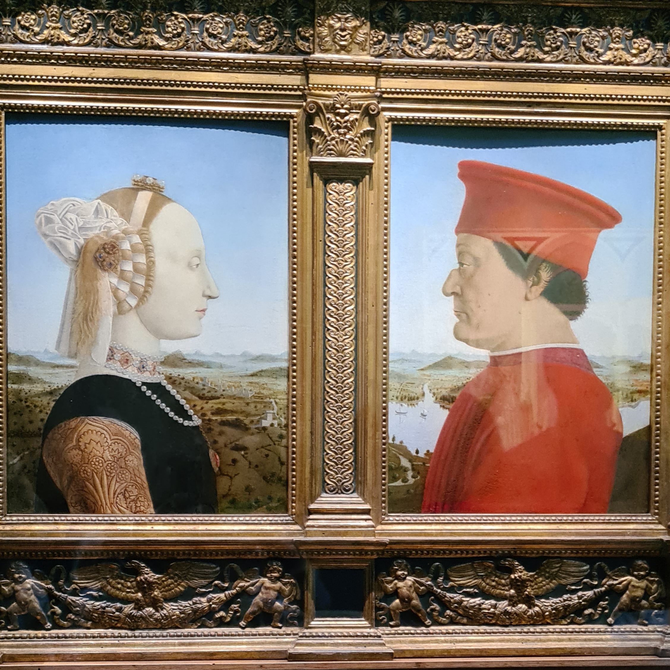The Duke and Duchess of Urbino: In the painting, the Duke is depicted from the left because of the wound on his right side. His wife, standing opposite him, is also portrayed with her forehead open in accordance with the beauty concept of the period. Second floor, room no. 8.