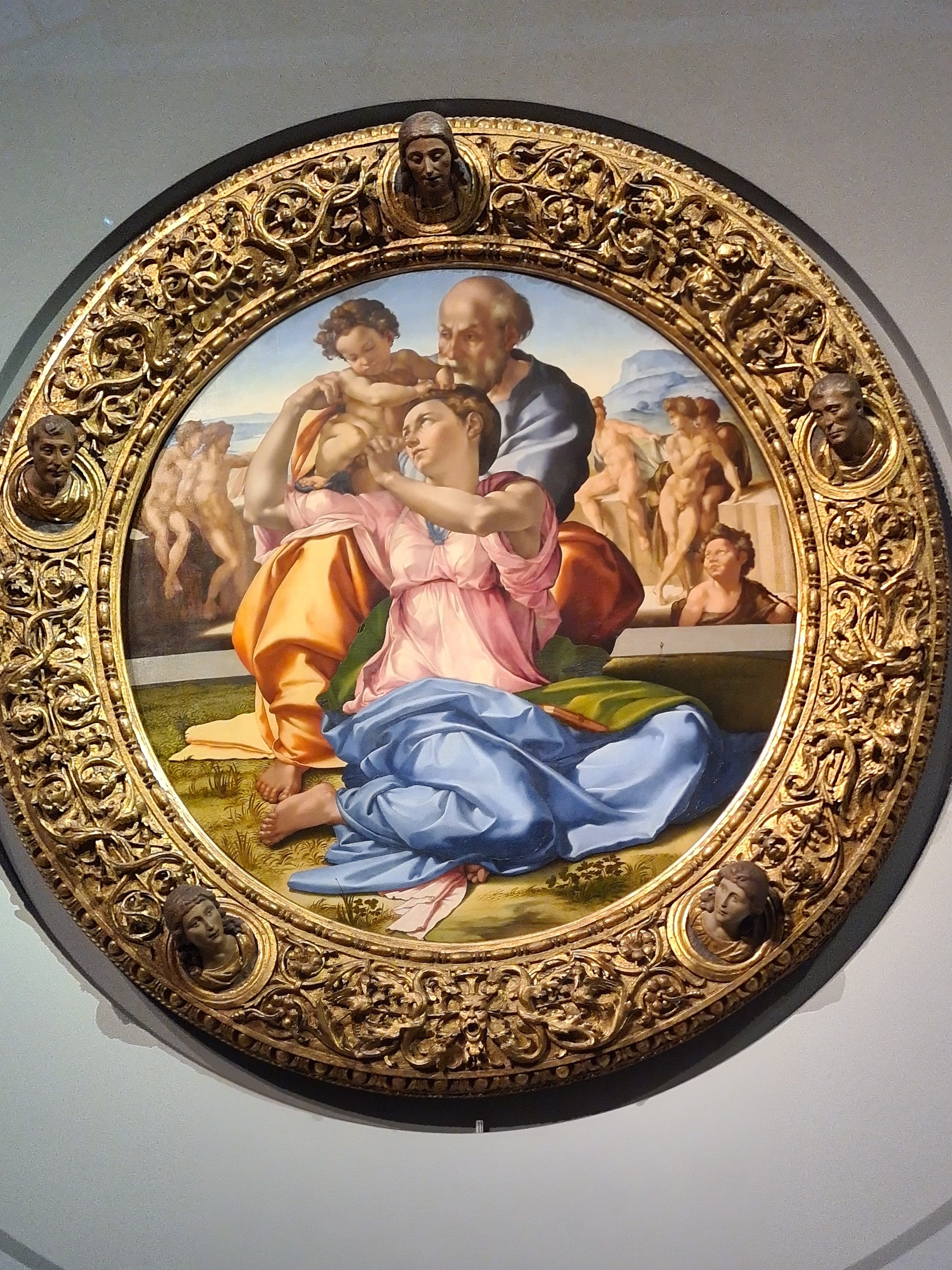 Holy Family with St. John the Baptist: The 1506 work features the child Jesus, Mary, Joseph, and a figure that is assumed to be John the Baptist and resembles the child Jesus, along with naked male figures in the background. It is also known as the Doni Tondo, inspired by the name of Agnoli Doni, who commissioned the tondo, meaning round-circle. Second floor, 35th hall