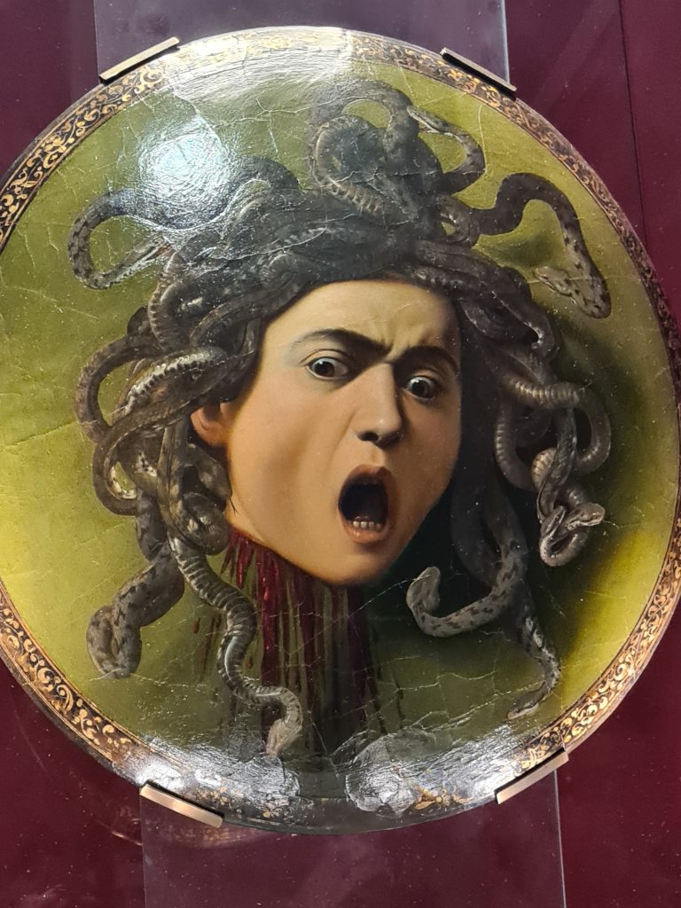 Medusa: One of the most important works in the gallery. The painting depicts the killing of the gorgon Medusa by the demigod Perseus. (Gorgons are terrifying female monsters with snake heads from Greek mythology.) Medusa turns those who look into her eyes into stone. Medusa has 2 other sisters. They do not have the ability to turn those who look into stone, but they have the ability to be immortal. Medusa thinks she is also immortal. While Perseus is on his way to kill Medusa, he encounters Athena and Athena warns him not to look into Medusa’s eyes and gives him a shield for protection. Caravaggio’s Medusa includes the moment when Perseus kills Medusa and the reflection of Medusa on the shield. The fear and surprise expression on Medusa’s face has been successfully conveyed. The artist used himself as a model in the work. 1st floor, room 90