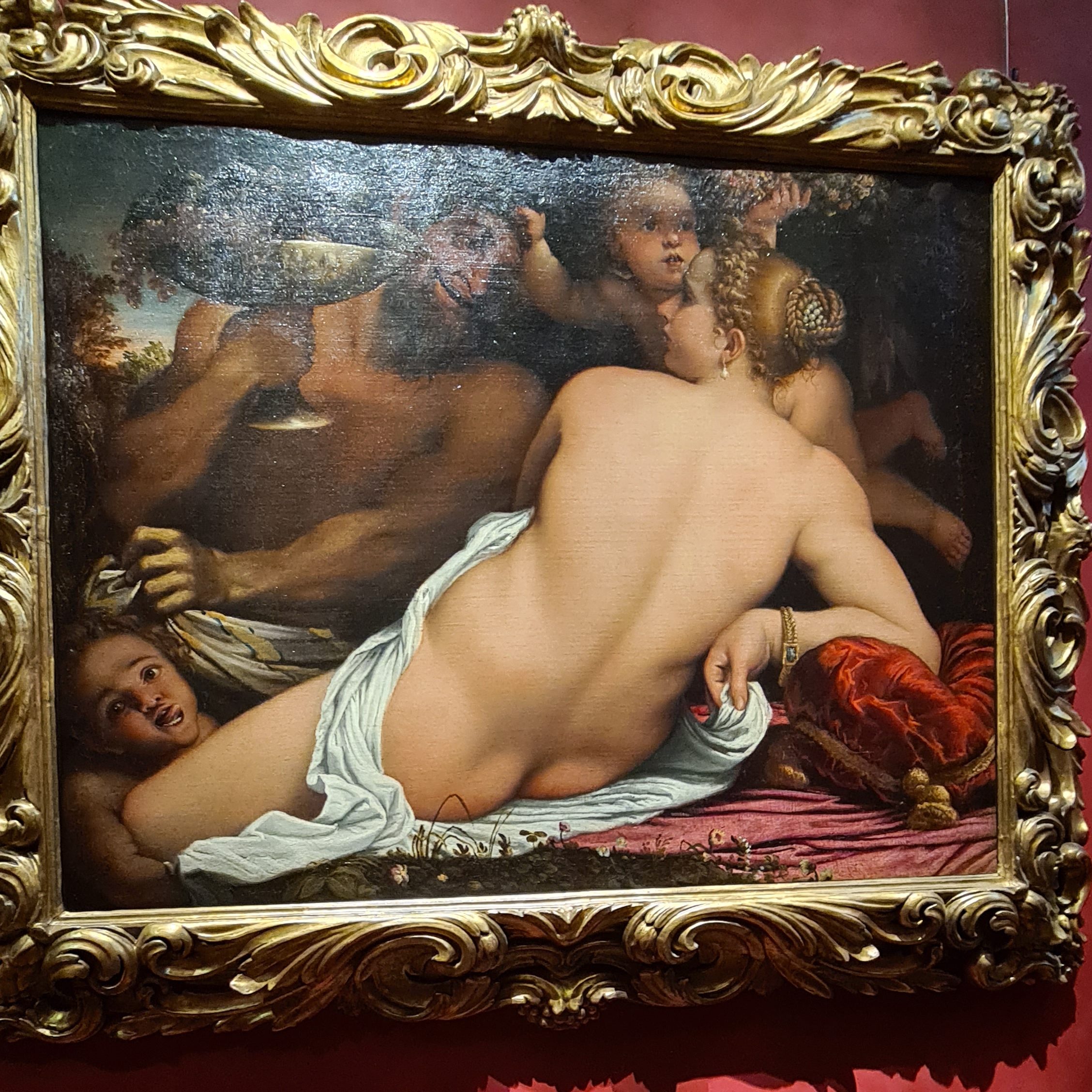Venus with a Satyry and two Cubids- (La Baccante): In his painting Venus, two satyrs and the god of love are depicted. A satyr is a half-goat, half-human forest creature in Greek mythology. It is known as a faun in Roman mythology. It is human from the waist up and goat from the waist down.