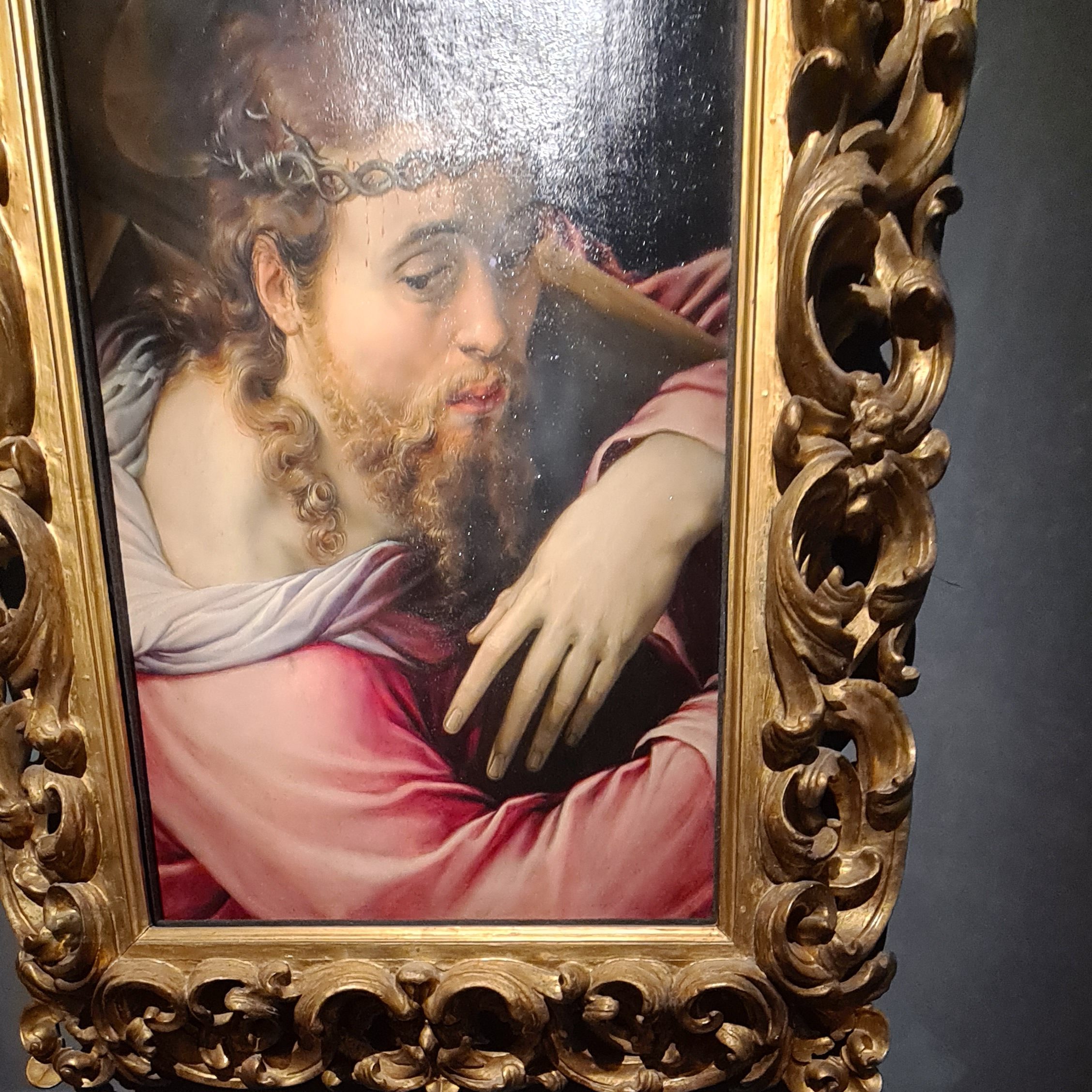 Christ Carrying the Cross: Jesus is walking towards Mount Calvary, the hill outside the borders of Jerusalem where he was crucified, with a cross on his back. This depiction was a very popular scene in the 16th century. The painting focuses on Jesus’ face.