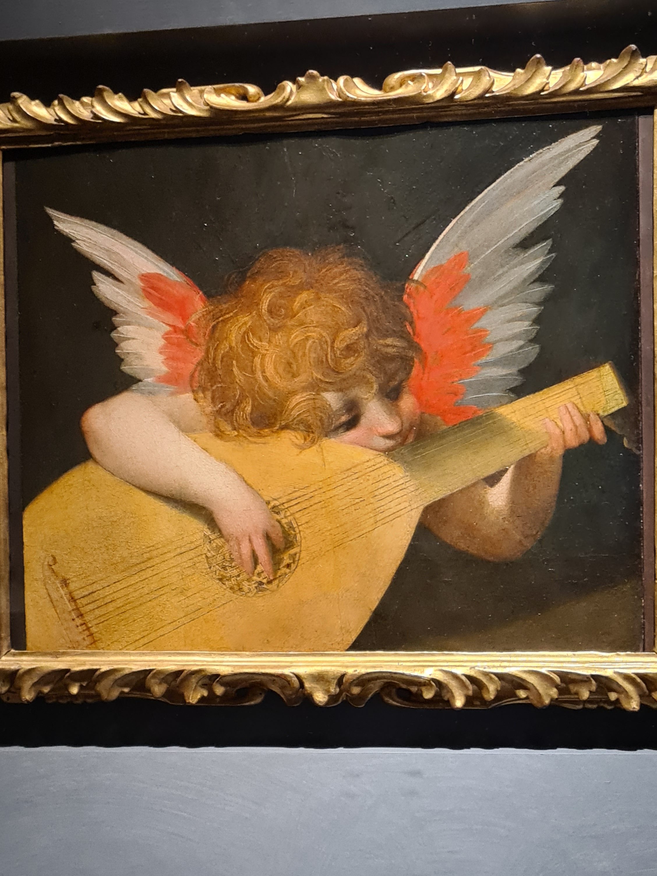 Angel Playing Lute: An angel is seen playing a musical instrument in a painting dated 1521. It is an example of the Mannerist style.