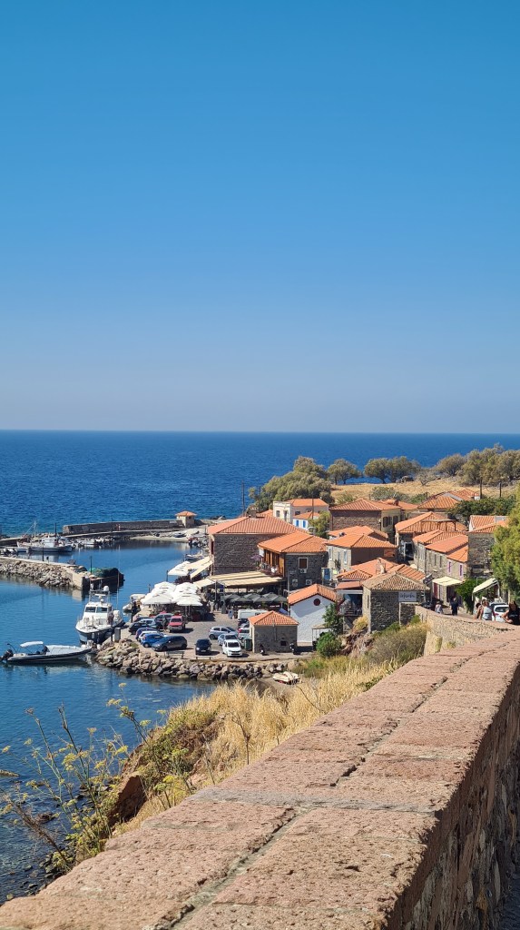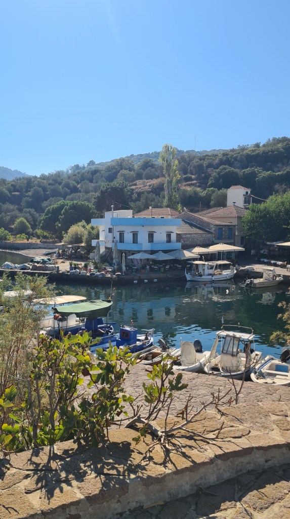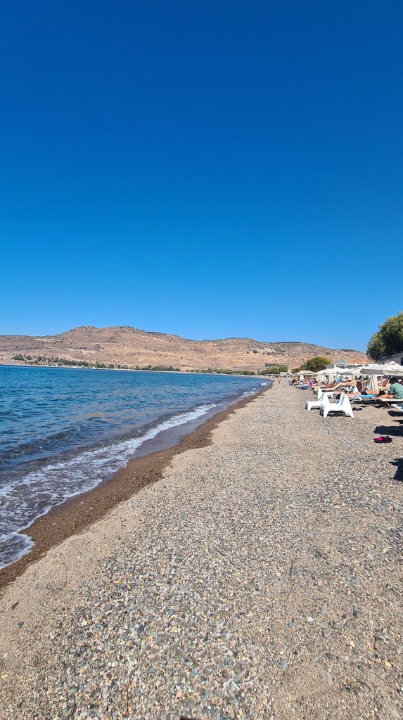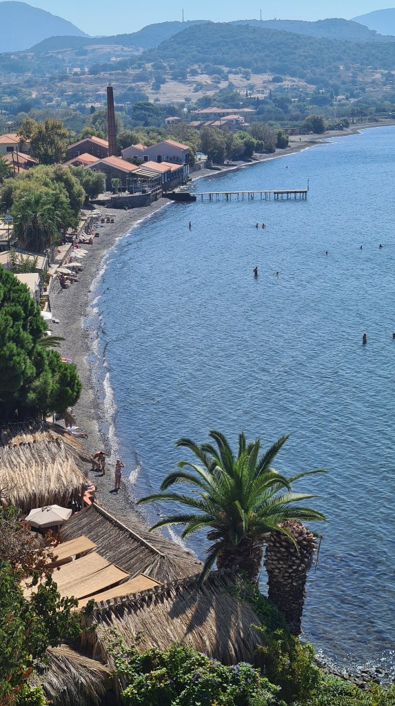 Gera körfezi Kalloni’ye göre daha küçük bir körfez. İç deniz olmasından dolayı burada da su göl gibi sakin. Burada da denize girmedik ama giren yerli halktan insanlar var. Araçla geçerken deniz harika görünüyor, kıyılar yosunlu da değil ama girince durum nedir bilmiyoruz. Yol boyunca manzarasına bayıldık, bir daha gelirsek denizi kesinlikle deneyeceğiz. Denize giremesek de yemeğimizi içme bölümünde detaylı olarak bahsedeğimiz Gera körfezindeki Bigla tavernada yedik.